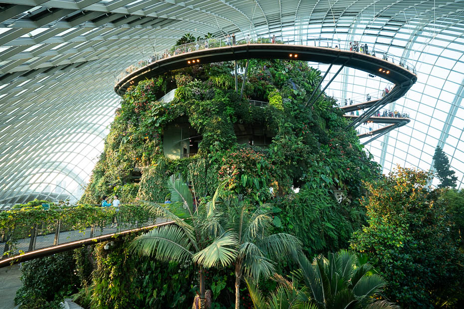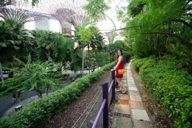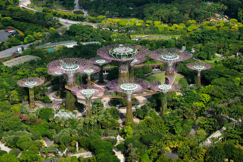 Tuvojas saulriets, un milzīgā cilvēku masa dodas skatīties mirgojošo mākslīgo koku šovu. Kad līdz tiem nonākam, mūs jau sagaida pūļi. Paejot nedaudz nost no tūristu takas, kamēr vēl ir gaišs un brīdis līdz šovam, izstaigājam parku krustu šķērsu, pievēršot uzmanību dabīgajiem kokiem, kas ir nosēti neparastu augļu – vienam tādas kā bumbiņas, citam, kā desiņas.