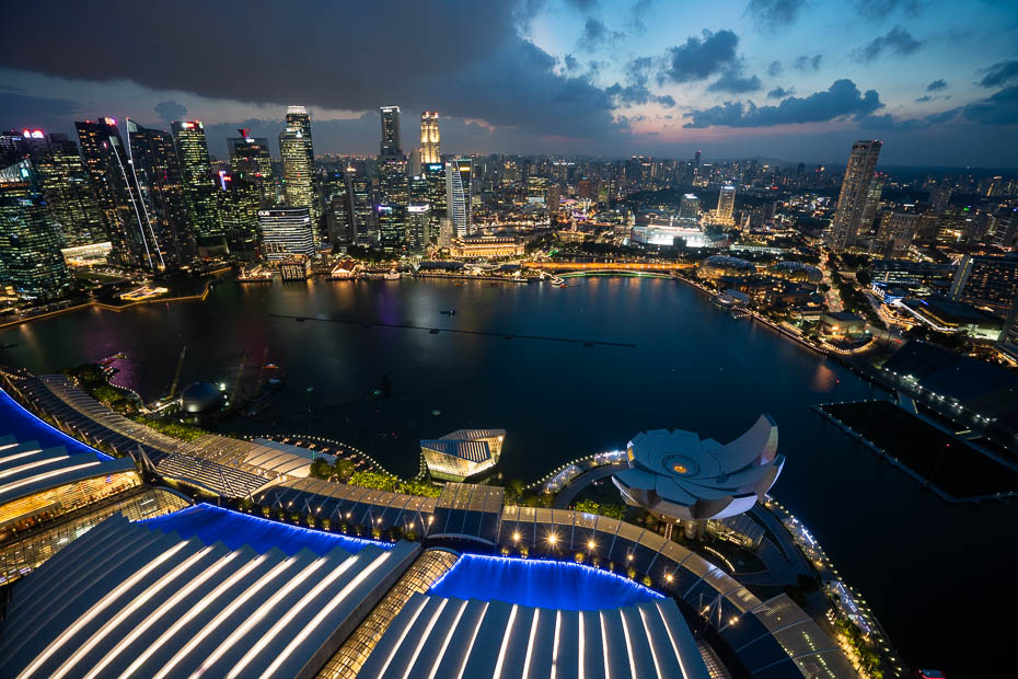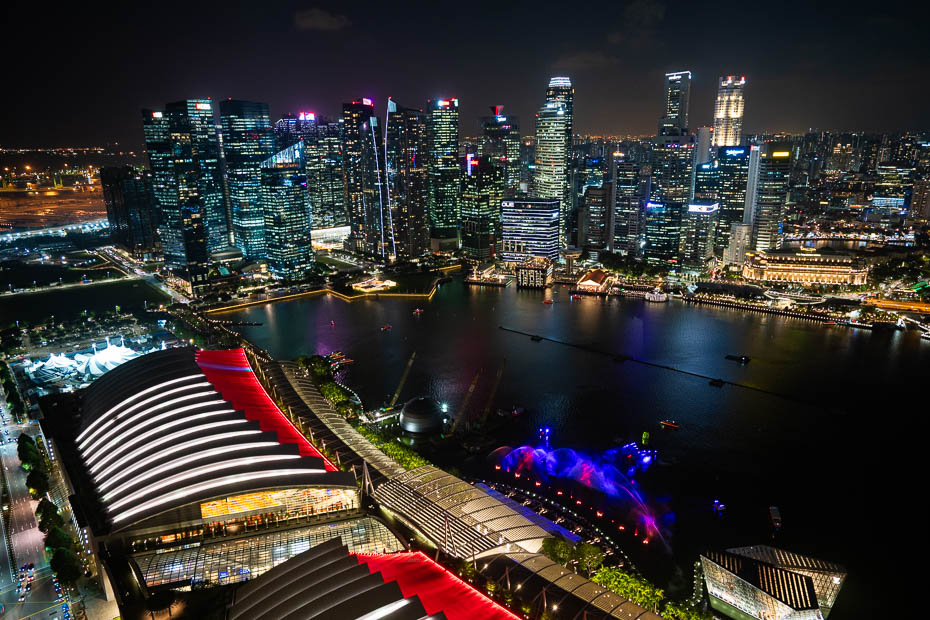 Saulrieta un “zilās stundas” brīdis Singapūrā ir īss, tāpēc drīz vien jau esam uz skatu platformas, kas mums kā viesnīcas viesiem ir pieejama bezmaksas, lai redzētu gaismas šovus ēkas abās pusēs. Cilvēku daudzums pirmo šovu laikā arī ir pamatīgs, tāds, ka grūti atrast brīvu vietu.