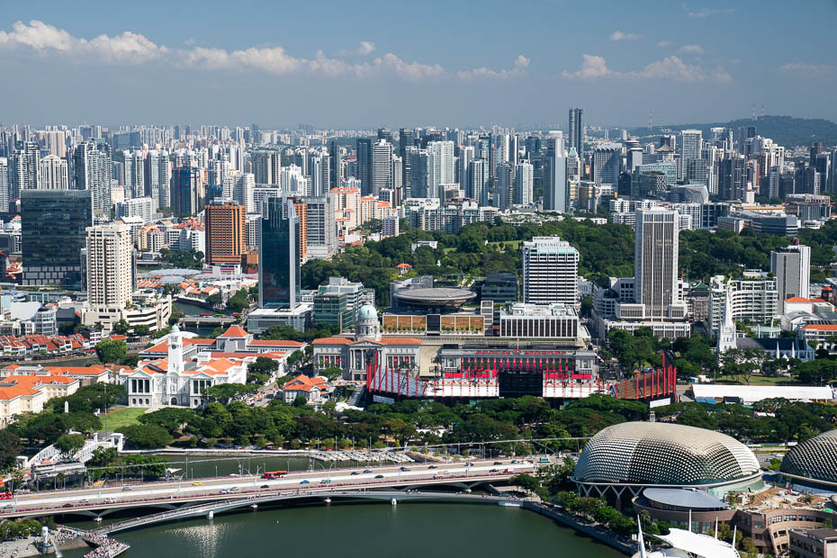 Drīz vien esam laukā, un tur skats iedvesmo daudz vairāk – fantastiskie lotosi pie mākslas centra un pilsētas panorāma liek aizrauties elpai! Skaistākie skati šoreiz ir bezmaksas. Turpat blakus izstaigājam arī milzīgo tirdzniecības centru. Ataust atmiņā “Traki bagātie aziāti” grāmata un filma, par pasakaini bagātajiem Singapūras elites pārstāvjiem. Ekskluzīvi pulksteņu veikali, dizaineru apģērbi. Cilvēku ir daudz, vieta skaista, taču mums liekas nomācoša. Šeit iepriekšējā dienā ēdām vakariņas tirdzniecības centra ēdamzālē, kurā ir īsta cīņa par sēdvietām – to visiem nepietiek, tāpēc jāsēž pie galdiņiem kopā ar nepazīstamiem cilvēkiem, tas ir, kad riņķojot ar paplāti beidzot izdodas izcīnīt kādu sēdvietu! Šoreiz nolemjam labāk kioskā blakus metro stacijai iegādāties maizītes un limonādes.