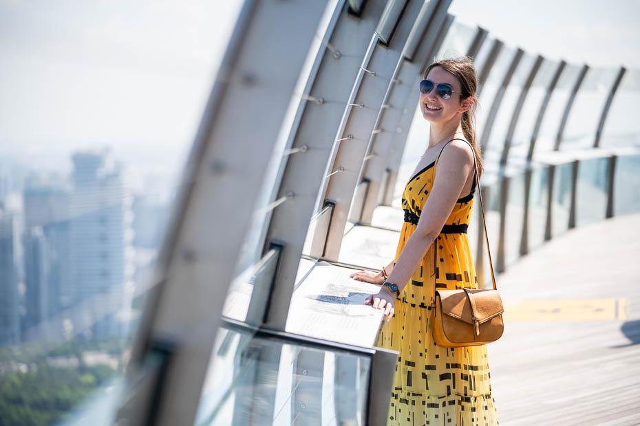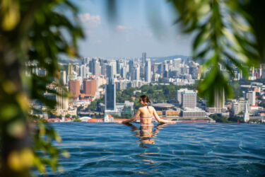 Beidzot atpūtušies, pabaudījuši skatu pa logu un padzēruši numuriņā izslavēto TWG Singapūras tēju, beidzot ejam augšā uz baseinu. Pēcpusdienā cilvēku daudzums tur ārprātīgs. Beigās tomēr stūrīti, kur nomest mantas, atrodam. Šī ir vieta, kur vairāk notiek pašiņu bildēšana un mini-fotosesijas, ne peldēšana. Lai arī no malas izskatās, ka baseins 57.stāva augstumā pieiet tieši pie malas, realitātē tam blakus ir neliela maliņa, un tad – vēl viena. Tāpēc, pat mēģinot no tā izlēkt, nekur tālu aizlēkt nesanāks!