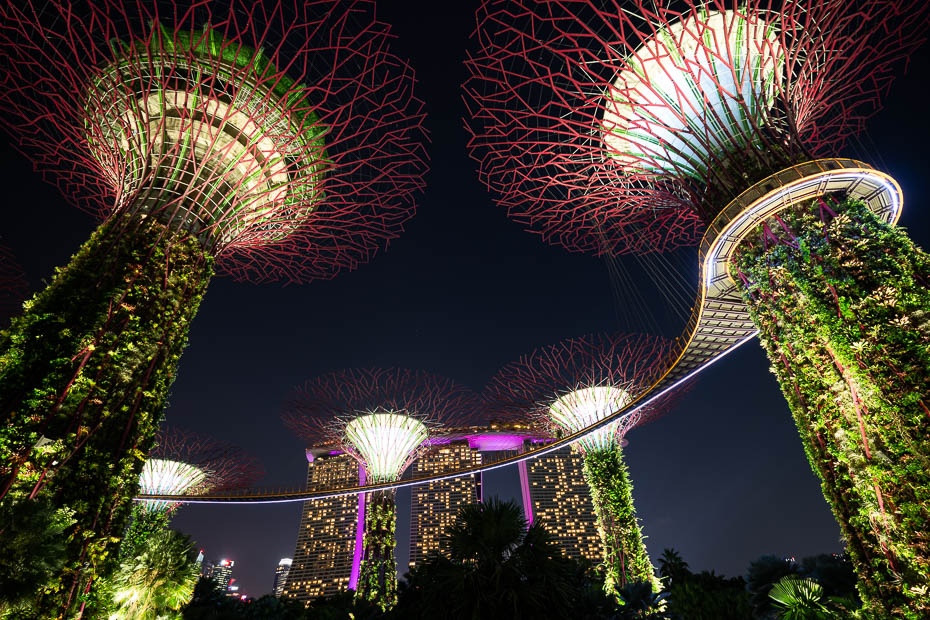 Drīz iestājas tumsa un izgaismojas milzīgie superkoki – mākslīgās instalācijas, kas mirgo mūzikas pavadībā. Daži cilvēki guļ zemē, citi – sēž, vēl citi – stāv. Šovs ir tik iespaidīgs, ka noskatāmies to divreiz. Vēl pirms doties prom, iegriežamies otrajā konservatorijā – ziedu dārzā. Tas jau tumsā, un paviljons ir gaumīgi izgaismots, lai vērotu skaistos ziedus.