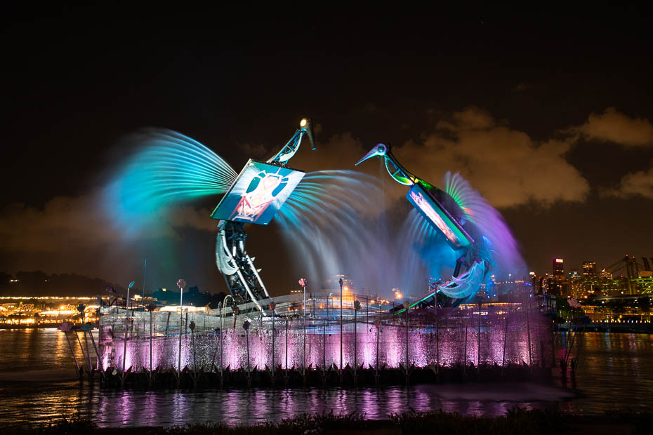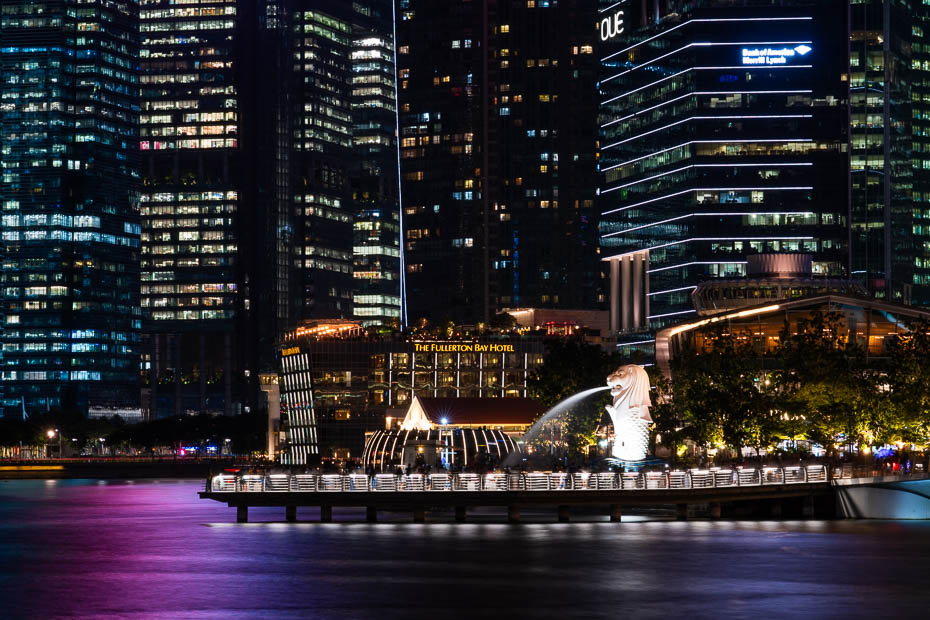 Atgriežoties pilsētas centrā, neskatoties uz nogurumu, braucam uz Merlion – strūklaku skulptūru, kas ir Singapūras simbols – pa pusei zivs, pa puse lauva. Šķiet, šī ir vieta, kurā top bildes “es biju te!” jo ir teju neiespējami izlauzties cauri pašiņu pūlim tai apkārt. Mūsu apmeklējuma dienā cilvēku ir īpaši daudz – vēlāk ir paredzēts salūts un cilvēki jau ir iekārtojušies ar statīviem, lai uzņemtu fotogrāfijas. Visā Latvijā nez vai ir tik daudz statīvu, cik tos redzam šajā vakarā krastmalā!
