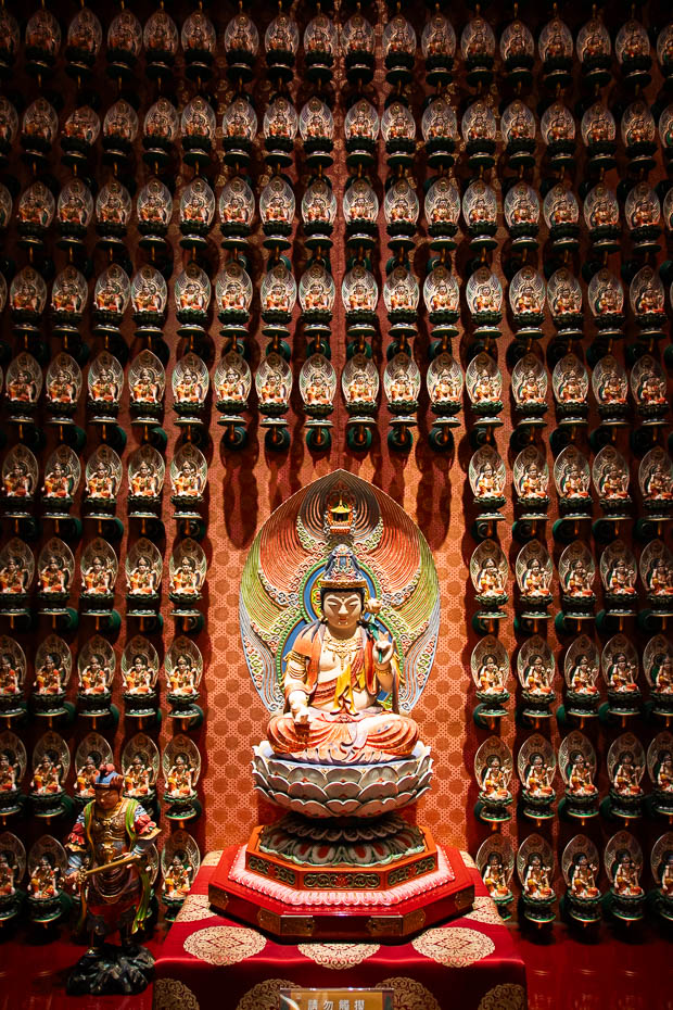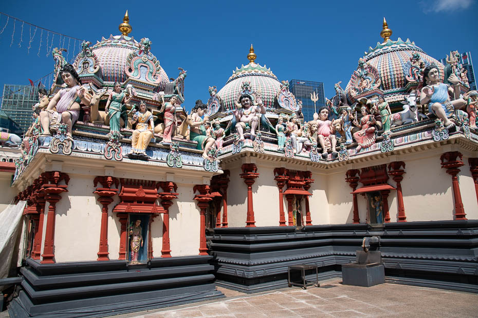 Tālāk ejam uz budistu templi – Buddha Tooth Relic temple. Pie ieejas paņemu lakatu, lai apsegtu plecus, un ar interesi aplūkoju templi. Singapūrā ir ļoti daudz dažādu tempļu, baznīcu un lūgšanu namu, turpat tālāk apmeklējam Sri Mariamman hinduistu templi, kuram ir iespaidīga jumta dekorācija. Tas gan, kā jau hindu tempļiem pierasts, ir jāapmeklē basām kājām. Pēc pastaigas nākas improvizēt ar ūdens pudeli un parastajām salvetēm, jo templi ir iecienījuši baloži. Nav gan obligāti jāiet iekšā tempļos, lai noķertu pilsētas sajūtu – fotogēniskie namiņi, kam gandrīz blakus slejas debesskrāpji, sīciņas mākslas galerijas, bāri un alus darītavas liek gribēt apstāties uz katra stūra!