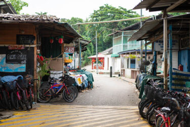 Kad esam galā, pūš vējš, pāri iet mākoņi un ceram, ka nelīs. Par laimi, debesis skaidrojas! Uz salas redzam būdiņveidīgas mājas, un milzum lielu daudzumu riteņu, kas novietoti nomas punktos. Laikam esam atbraukuši kādā ne tik tūristu pilnā dienā. Ņemam riteņus un dodamies izbraucienā pa salu. Uz koka dēlīšiem klātajām takām velosipēdus nav atļauts izmantot, tur jādodas ar kājām. Te arī lieti noder pie takām izvietotie dzērienu automāti. Pēc garākas pastaigas salda un vēsa limonāde ir patiesi atspirdzinoša!
