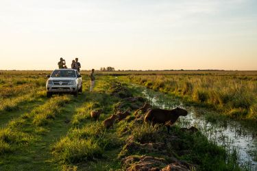 Viņa estancijā dzīvo 2500 lopu, un arī ar tiem viņš pagūst darboties, tur gan viņam palīdz vairāki gaučo. Redzēt gaučo pārdzenam lopus ir neaizmirstams skats. Berete, strīpainas bikses un plikas kājas. Ne mazākā satraukuma par odiem. Kad braucam ar viņa pikapu pa plašajiem laukiem (un dažbrīd tik bedrainajiem ceļiem, ka, liekas, te paliksim), pārsvarā redzam govis un zirgus, taču arī pa kādam ēzelim. Izrādās, tie ir ļoti tramīgi un brīdina citus dzīvniekus par plēsēju klātbūtni. Vilkus, lielākoties, manām tikai tālumā, un arī tikai tāpēc, ka ar binokļiem uzmanīgi vērojam pamali. Te dzīvo arī kaķveidīgie, bet tos gan ir teju neiespējami ieraudzīt.