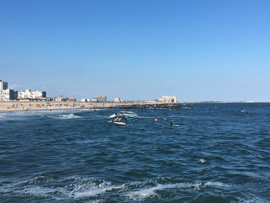 Manas dzīves vēlmes un sapņa piepildījums – dienu pēc aktīvas ripošanas – 9.jūlijā daži draugi dodamies uz pilsētas tālāko nostūri – Far Rockaway beach – vienīgā vieta Ņujorkā, kur ir iespējams piekļūt okeānam (ir iespēja tikt arī pie jūras, kas ir tuvāk – Brighton beach – kur arī atrodas lielākais štata Lunaparks ar Amerikāņu kalniņiem un citām trakām izpriecām; $50 samaksājis, vari pavadīt tur visu dienu). Tikko 2h pavadījuši zilās līnijas ‘A’ metro vagonā, mēs ierodamies kārotajā galamērķī, un, lai tiktu līdz pludmalei, ir jāsoļo vēl kādas 5 minūtes, kas iedzin Tevi vēl lielākā okeāna izsalkumā. Izkāpuši no metro, burtiski pirmais, ko es pamanu, ir sērfinga dēļu noma, kas liecina, ka pludmale noteikti ir TĀ vērta un plaši apdzīvota ar saules un viļņu medniekiem. Tuvojoties, aiz apvāršņa jau dzirdam un redzam plašo un zelta smiltīm bagāto pludmali. Redzot sērfotājus, saprotu, ka nevaru laist garām šādu iespēju un dodos pakaļ arī savam dēlim (3h=$25). Tā lieliskā sajūta, kad Tu “noķer” vilni ir neaprakstāma, tā ir jāizbauda – brauc un dari; protams, desmitiem reižu tieku arī noskalots zem ūdens ar lielo viļņu uzlidojumu, bet arī tā sajūta man sagādā prieku. Dienu aizvadām pludmalē, kura atgādina Miami piekrasti (pēc Holivudas filmu skatiem) un laimīgi, noguruši no atpūtas un dēļošanas, dodamies atpakaļ uz nu jau mīļo Bronksu, lai atgūtu elpu nākamās dienas piedzīvojumam.