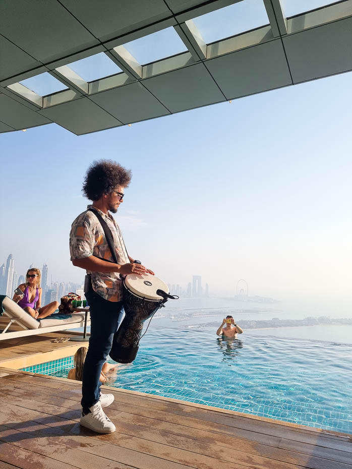 Tikko kā atnācām, pamanīju, ka baseinā ir ārkārtīgi skaļa mūzika. Sajūta, kā klubā, nevis tādā atmosfēriskā vietā kā šķita redzētajās fotogrāfijās un video. Vienīgā puse, kur bija klusāks, bija uz Burj al Arab. Biju paņēmusi līdzi grāmatu lasīšanai, bet tādā troksnī vienkārši nebija iespējams lasīt, likās, ka nedzirdi savas domas, kur nu vēl spēt saprast izlasīto. Iespējams, ka mūzikas skaļums mainās, jo citi mani draugi teica, ka īpašu skaļumu nepamanīja, tāpēc varbūt tā nav vienmēr.