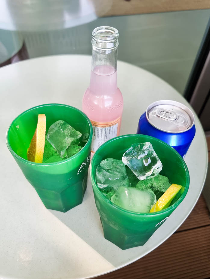 Mūsu apmeklējuma laikā (2022.gada rudenī) par vienu mazo limonādi stikla pudelītē un vienu bundžiņu samaksājām 19 eiro. Tātad, bezalkoholiskie dzērieni vien jau bija virs 9 eur par vienu! Alkoholiskie kokteiļi viens maksāja ap 23 eiro, bezalkoholiskie kokteiļi vai alus ap 16 eiro, espresso ap 8 eiro.Var pasūtīt arī ēdienus – 8 suši ap 30 eiro, saldais 16 eiro, otrais bez piedevām ap 40 eiro (piedevas atsevišķi). Mūsu apmeklējuma laikā divas reizes redzēju, ka piedāvā bezmaksas augļus – uz kanapē kociņiem uzsprausti ananāsa un citu augļu gabaliņi.