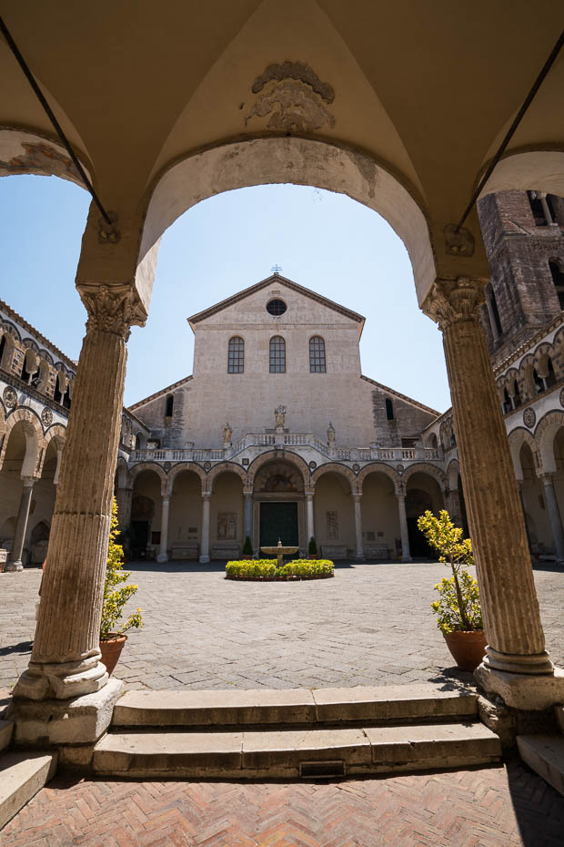 Salerno nekāda lielā pastaiga mums nav plānota, jo galvenokārt jau gribam uzreiz ar skubu doties tālāk, uz Amalfi piekrasti, taču, esot uz vietas, jāizmanto iespēja redzēt arī labāko no šīs pilsēas! Nolemjam, ka vēl no rīta, kamēr nav svelme, jāaizstaigā uz 11.gs celto Salerno katedrāli, kas veltīta Sv.Matejam un kura pīšļi atrodas pagrabstāvā, kapenēs. Iekšā baznīcā ir patīkami vēss un arī kluss. Esam teju vienīgie apmeklētāji. Brīdi izbaudām krāšņi dekorētās kapenes, pastaigājam pa baznīcas pagalmu un dodamies tālāk.