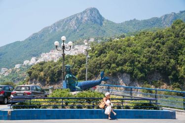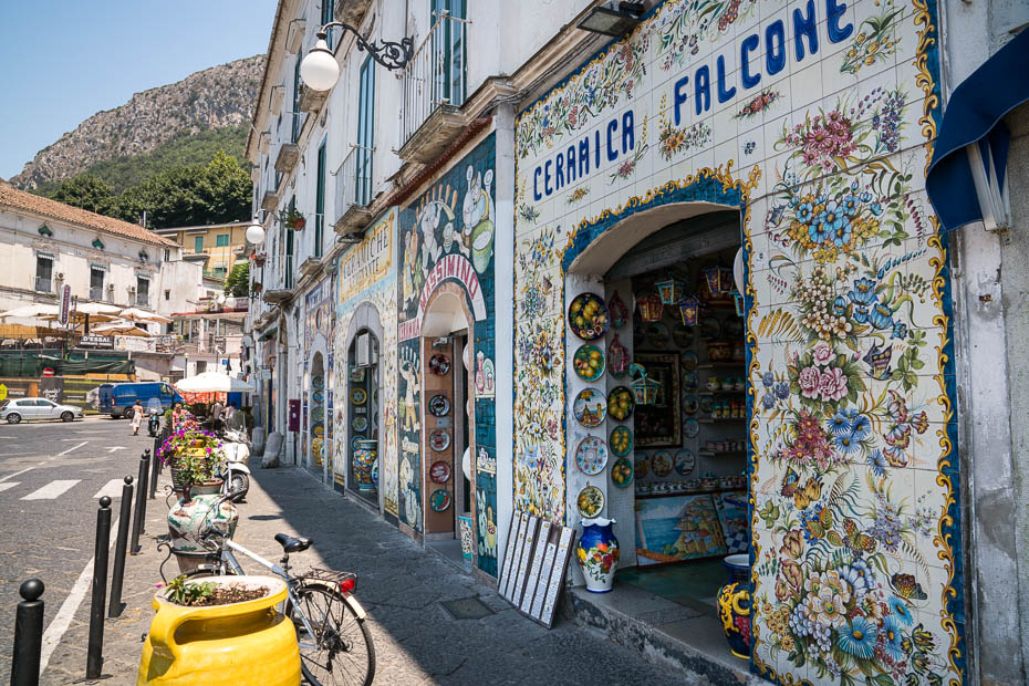 Pilsētiņā uzskavējamies vien mirkli – iegriežamies dažos keramikas veikalos, kuram vairumam iekšā novietota zīmīte – nefotografēt! Papriecājamies par nāriņas skulptūru un jāskrien tālāk. Šo slavenāko ceļa posmu brauksim vien divas dienas, un daļu laika jau esam iztērējuši Salerno. Bet vēl Cietara, Erchie, Maiori, Minori, Ravello, un, protams, Amalfi bet dienas gaismas laiks te ir krietni īsāks nekā Latvijā! Esam pierezervējuši viesnīcu vien 2km no jūras krasta, un esam noskaņoti ilgi negulēt, bet skatīties visu līdz pēdējam. Arī tas sanāk ne bez pārsteiguma!