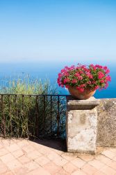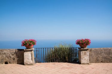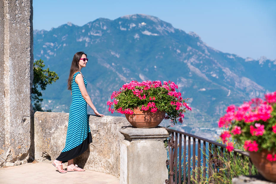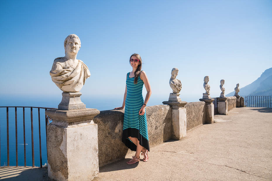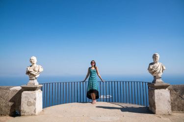 Tā kā pilsētas varēsim apskatīties arī vēlāk, nolemjam vispirms “bliezt” uz Ravello, kur atrodas Villa Cimbrone, kuru var apmeklēt tikai līdz saulrietam. Nelielā pastaiga pa pilsētas ielām uz villas pusi jau liek svīst tā, ka drēbes ir izspiežamas, un beidzot drīz nokļūstam 11.gs celtajā villā. Lai arī tajā maz kas ir palicis no oriģinālajām ēkām, pats galvenais, Bezgalības terase (Terrazzo dell’lnfinito), ir uz vietas. Populārajā kultūrā tā nesen izskanējusi kā viena no “Wonder Woman” filmēšanas vietām – balkons, uz kura karaliene Hipolita tur rokās maziņu Diānu.