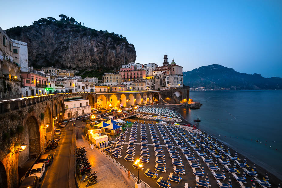 Tālāk izstaigājam pašu Amalfi pilsētiņu. Pie katedrāles notiek gatavošanās svētkiem, tiek uzstādīta atskaņošanas aparatūra. Paēdam ātru launagu kādā terasē un skrienam uz krastmalu, meklēt skaistāko vietu “zilās stundas” fotogrāfijām. Vietu tik daudz, bet tas brīdis ir tik īss!