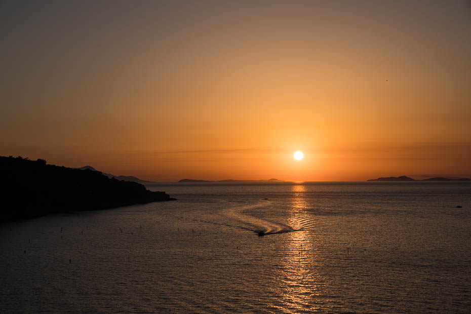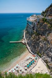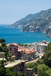 Nākamā pietura ir Vietri Sul Mare. Manā mājās sastādītajā maršrutā, vadoties no citu ceļotāju plāniem, vien rakstīts “nobraukt lejā ar auto līdz pludmalei, novietot auto stāvvietā un skats no tās”. Un kā vērts ir šis skats! Te mēs pirmo reizi ieraugām, kāpēc gan Amalfi ir tik izslavēta. Klintis vienā pusē, karaliski azūrzila jūra otrā, un ar migliņu virs tās, tā saplūst ar zilajām debesīm. Vien pēc kuģu aprisēm var spriest, kur beidzas jūra, bet kur sākas debesis.