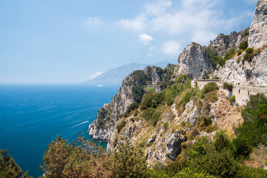 Tālāk gribam uzbraukt augšā kalnā, tam ir pieejams trošu ceļš, kur katram ir sava sēdvieta. Skati pa ceļam nav īpaši iespaidīgi, taču, kad sasniedzam Monte Solaro, no šejienes ir grūti aiziet prom. Skats uz nelielu līcīti ar klintīm, jahtām un buru laivām tām blakus, košie ziedi un neliela skulptūra paliek atmiņā kā viena no spilgtākajām atmiņām visā Amalfi brauciena laikā.