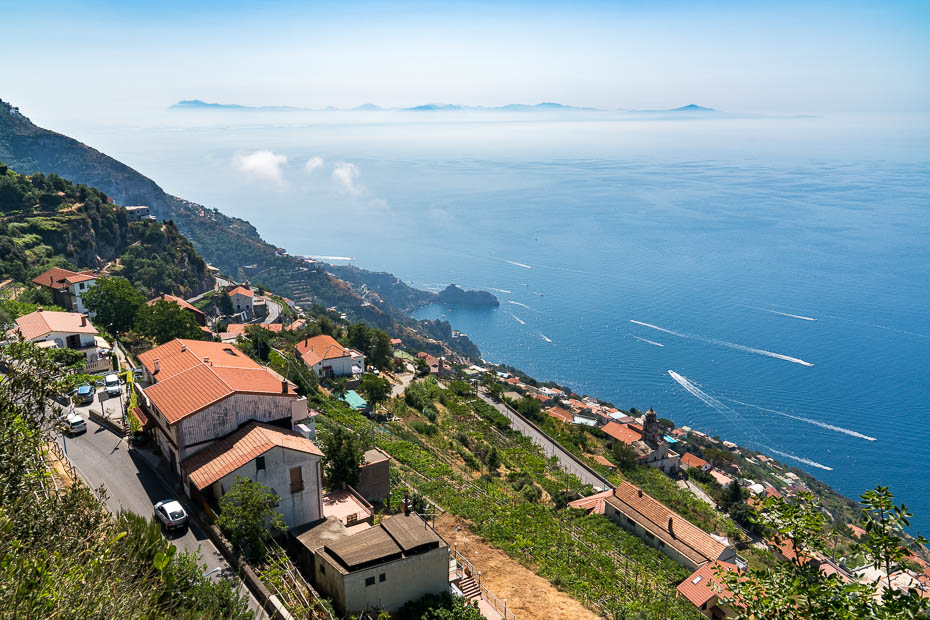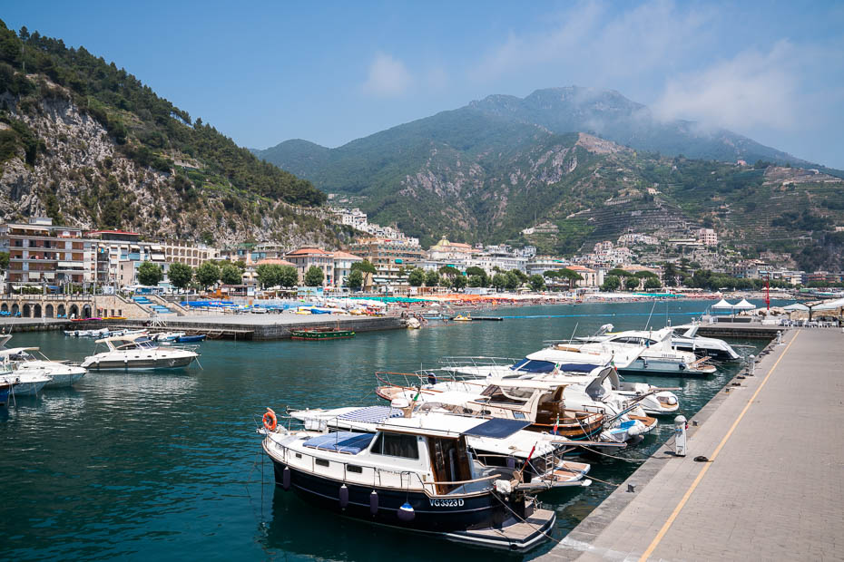 Nākamā pietura ir Vietri Sul Mare. Manā mājās sastādītajā maršrutā, vadoties no citu ceļotāju plāniem, vien rakstīts “nobraukt lejā ar auto līdz pludmalei, novietot auto stāvvietā un skats no tās”. Un kā vērts ir šis skats! Te mēs pirmo reizi ieraugām, kāpēc gan Amalfi ir tik izslavēta. Klintis vienā pusē, karaliski azūrzila jūra otrā, un ar migliņu virs tās, tā saplūst ar zilajām debesīm. Vien pēc kuģu aprisēm var spriest, kur beidzas jūra, bet kur sākas debesis.