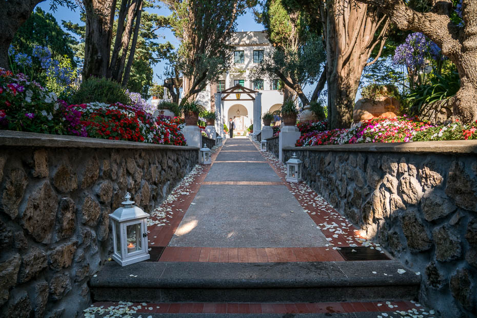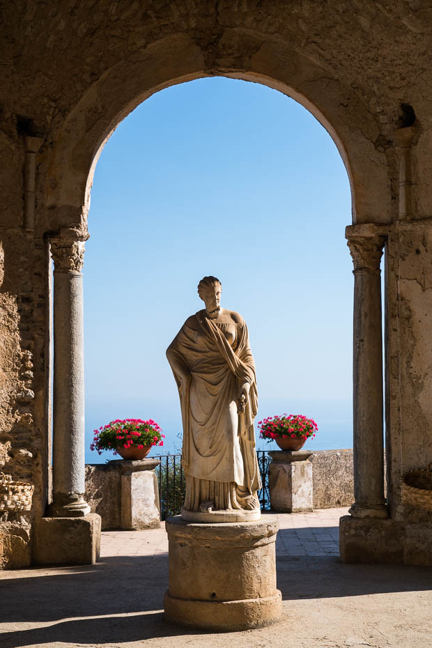 Tā kā pilsētas varēsim apskatīties arī vēlāk, nolemjam vispirms “bliezt” uz Ravello, kur atrodas Villa Cimbrone, kuru var apmeklēt tikai līdz saulrietam. Nelielā pastaiga pa pilsētas ielām uz villas pusi jau liek svīst tā, ka drēbes ir izspiežamas, un beidzot drīz nokļūstam 11.gs celtajā villā. Lai arī tajā maz kas ir palicis no oriģinālajām ēkām, pats galvenais, Bezgalības terase (Terrazzo dell’lnfinito), ir uz vietas. Populārajā kultūrā tā nesen izskanējusi kā viena no “Wonder Woman” filmēšanas vietām – balkons, uz kura karaliene Hipolita tur rokās maziņu Diānu.