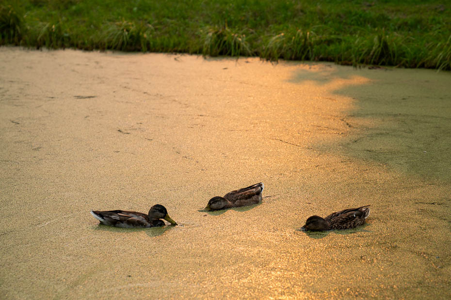 Pēc mirkļa esam ezera vidū. Tālumā nedaudz dzird šoseju. Otrā ezera pusē golfa laukumā ir aktīva rosība jau no paša rīta. Mums ezerā kompāniju sastāda tikai divu cekuldūkuru pāri. Vērojam, kā tie ienirst un tad cenšamies uzminēt, kur tie iznirs laukā. Te, ezera viducī liekas, ka ir apstājies laiks, apkārt notiek kustība, bet mēs tikai slīdam pa ūdens virsmu, mazajiem vilnīšiem sitoties pret laivas sāniem.